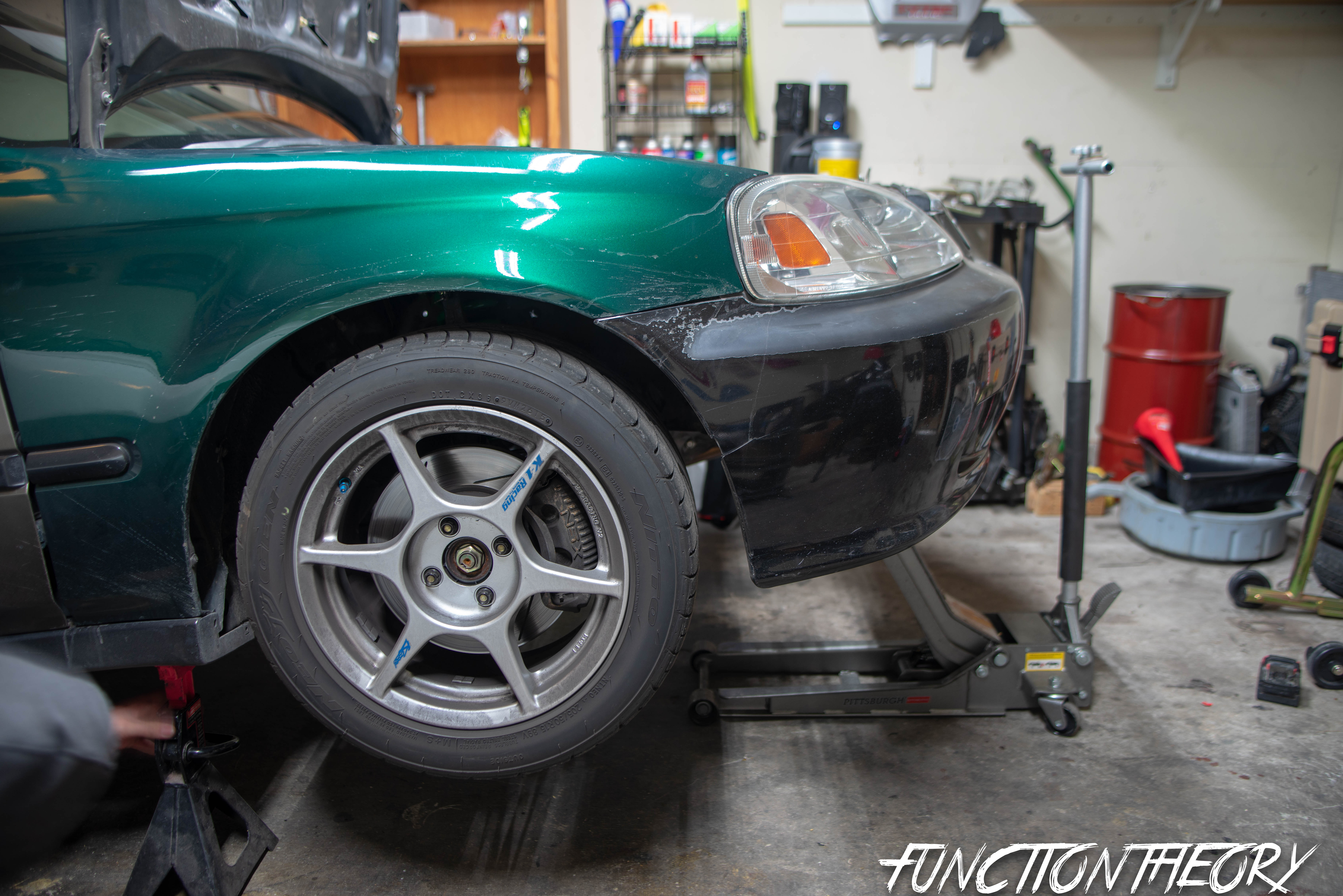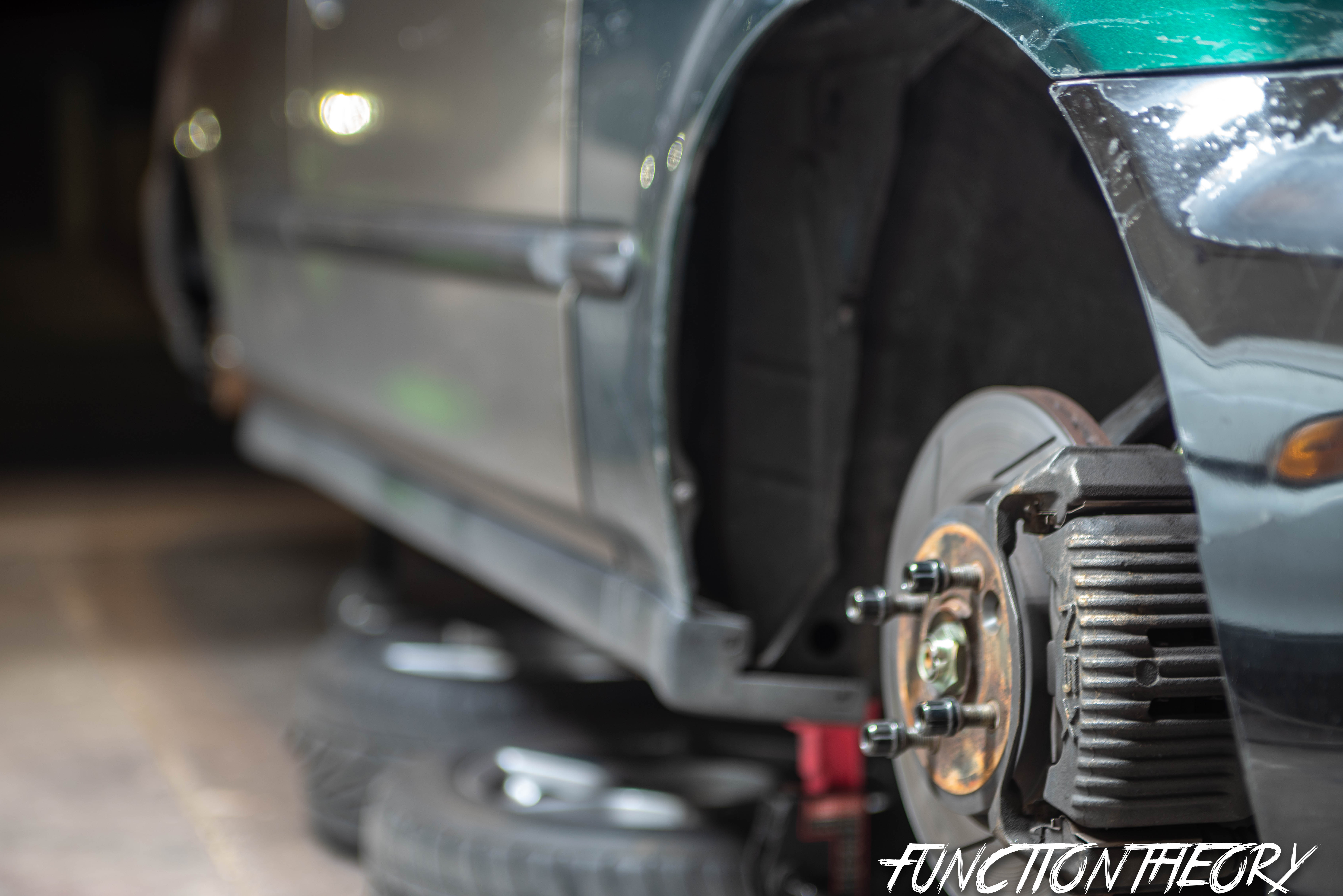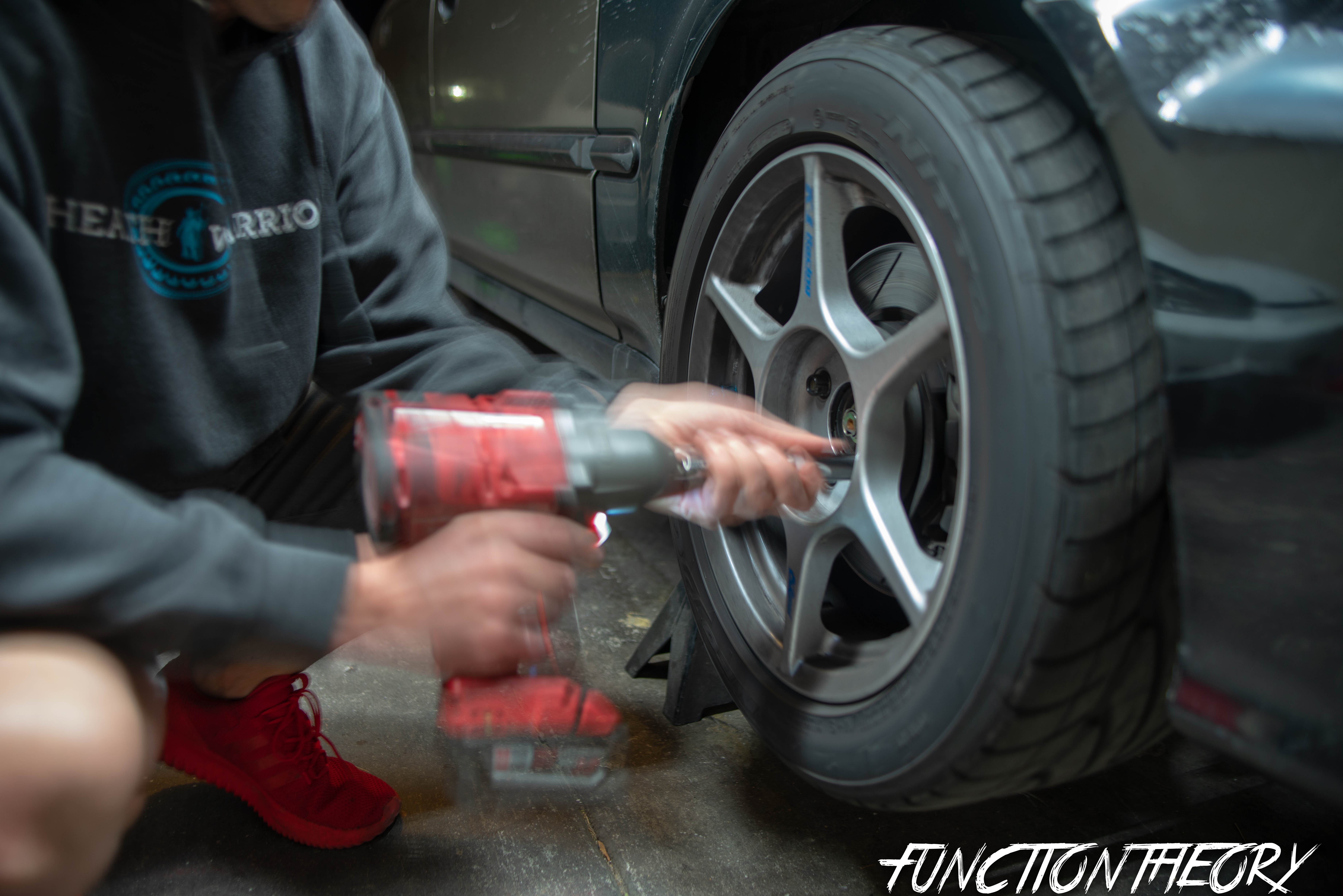 Jack the car up, put on four jack stands, remove wheels and place them under car for that extra safety net in case cars falls off stands. I’m so happy Ever brought over his Milwaukee impact, it makes removing wheels super easy.